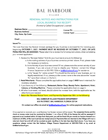 Annual renewal notice for Bal Harbour business licenses, required to maintain legal operating status and pay the local business tax fee.