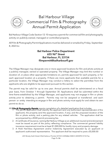 Annual permit required for commercial film and photography activity on public property in Bal Harbour, with insurance and indemnification requirements.