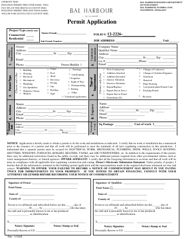 Standard building permit application for residential or commercial projects in Bal Harbour, covering new construction, renovations, fences, drainage, and change-of-use work.