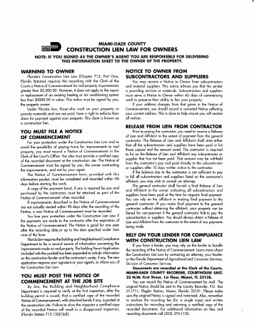 Information sheet explaining Florida's construction lien law requirements for property owners undertaking improvements over $2,500 and the Notice of Commencement filing requirement.