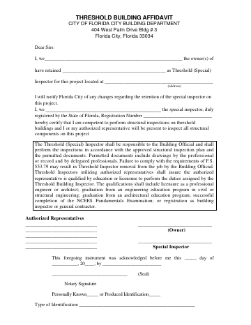 Affidavit confirming appointment of a qualified special inspector to oversee structural inspections on threshold buildings in Florida City.