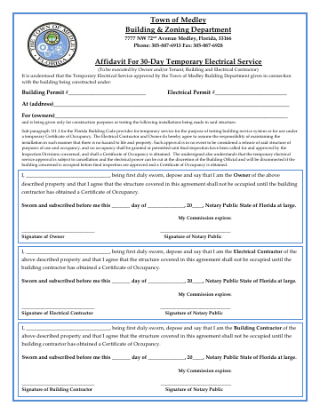 Electrical 30-Day Temporary Service Affidavit