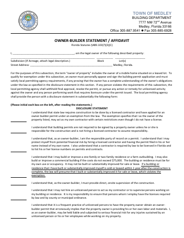 An affidavit enabling property owners to perform construction work on their own property without a contractor license, as permitted under Florida law.