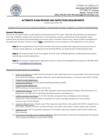 Complete documentation packet for registering private plan reviewers and inspectors with the town, required under Florida's alternate review program.