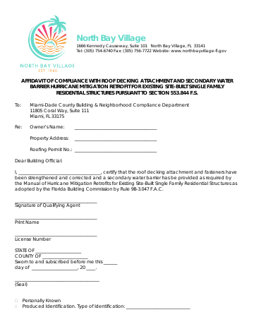 Affidavit of Compliance with Roof Decking Attachment and Secondary Water Barrier