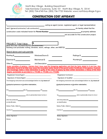 Sworn statement certifying that construction costs listed on a building permit are accurate. Required for all construction projects in North Bay Village.