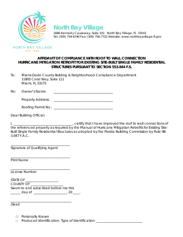 Affidavit certifying that a residential property's roof-to-wall connections meet Florida hurricane mitigation retrofit standards and building code requirements.