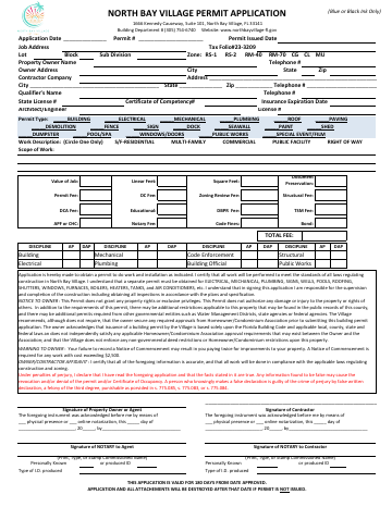 General permit application for new residential, commercial, or public development projects in North Bay Village, including checkbox options for multiple permit types and waiver considerations.