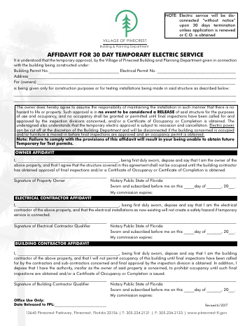 Affidavit required to obtain temporary electrical power during construction, ensuring the property remains unoccupied until final inspections pass.