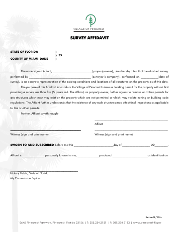 A property owner's sworn statement confirming that an existing survey accurately represents structures and conditions on their property for permit purposes.