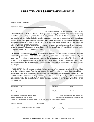 Affidavit certifying that fire-rated penetrations, joints, and seals in a building project meet Florida Building Code and testing standards.