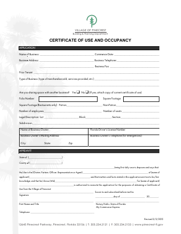 Application for a business to obtain authorization to operate at a specific location, required when opening or relocating a commercial tenant in Pinecrest.