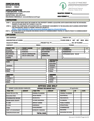 General permit application for building, electrical, mechanical, plumbing, or zoning work in Pinecrest requiring notarized signatures from the property owner and qualified contractor.