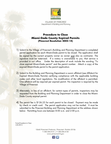 A procedural guide for property owners closing expired Miami-Dade County permits through Pinecrest's Building and Planning Department, requiring a notarized permit application and compliance affidavit.