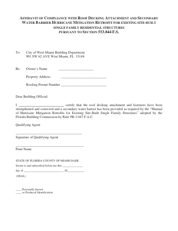 Affidavit of Compliance with Roof Decking Attachment and Secondary Water Barrier Hurricane Mitigation Retrofit
